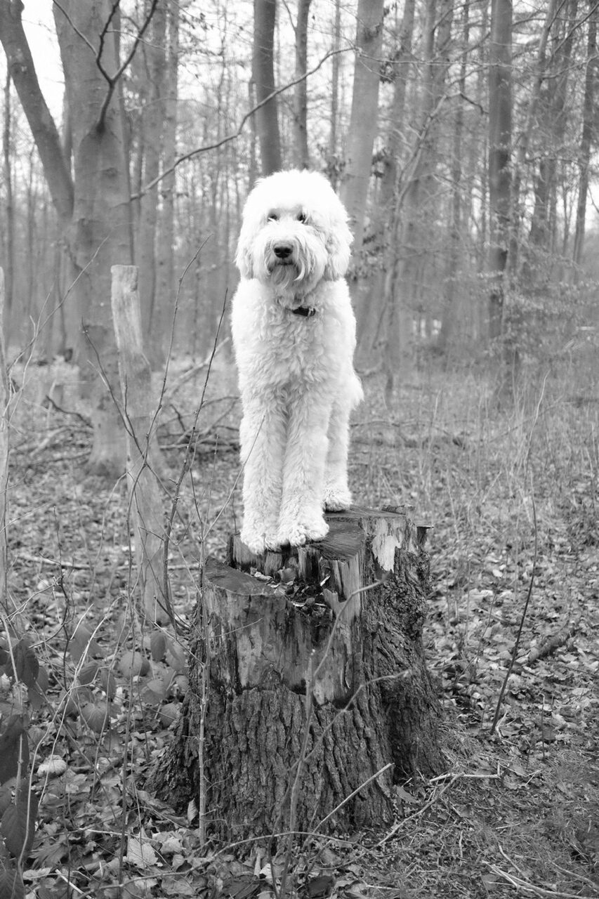 Am Nachmittag waren wir zu dritt im Stadtwald unterwegs. Dabei kamen wir an einer Stelle vorbei, an der wir vor einiger Zeit schon einmal versucht hatten Juni auf einen Baumstumpf springen zu lassen. Aber als wir sahen, dass die Oberseite vereist war, haben wir das Unterfangen abgebrochen. Heute war da kein Eis, die Oberfläche war sogar recht gut abgetrocknet, keine Gefahr also die kleine Übung in den Spaziergang einzubauen. Natürlich habe ich davon ein Bildchen geknipst – unter eher miesen Lichtverhältnissen. Eigentlich war alles eine einzige graue Soße. Da kann man als Fotograf nur versuchen alle Bildinformationen einzusammeln, um dann im zweiten Schritt das Bild am iPad zu optimieren. Damit es so aussieht, wie ich es vor Ort mit meinem inneren Auge wahrgenommen habe. Und den Unterschied zwischen einer Datei, die flach und überbelichtet daherkommt, aber alle Tonwerte umfasst und dem, was ich am Tablett an Anpassungen vorgenommen habe, zeige ich euch jetzt mal.